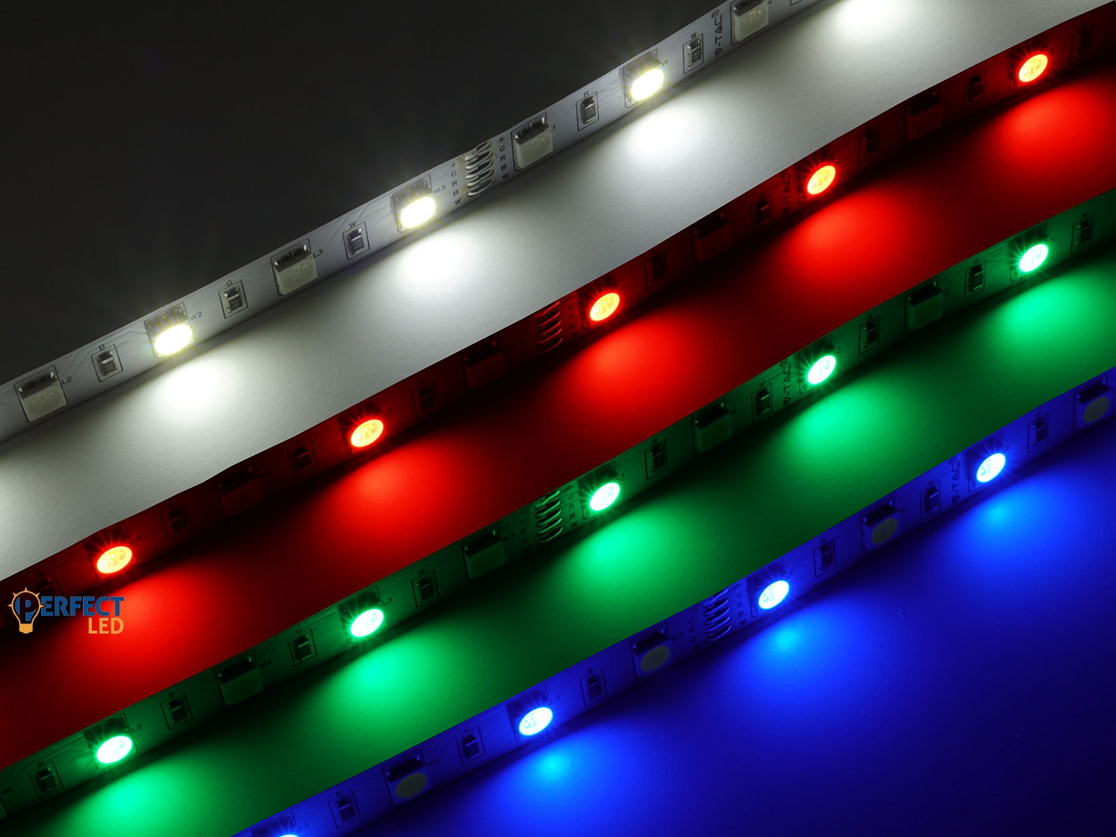 A változtatható színű RGB LED szalagok fehér fénye három különböző színű (Piros/Zöld/Kék) LED chipből áll elő, így az RGB LED szalagok fehér fénye kevésbé egyenletes színű mint egy egyszínű LED szalagnak.