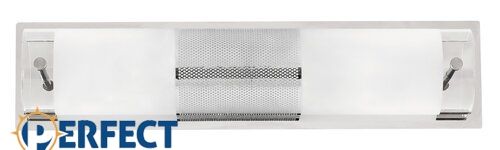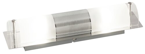Modern megjelenésű fürdőszobai fali lámpa, 2 darab E14-es foglalattal. 38 cm széles, króm színű fémből készített lámpatest, opálüveg és áttetsző, hálós fém búrával. A lámpatest E14-es foglalatú, max. 2x 40W teljesítményű  halogén vagy energiatakarékos fényforrásokkal is használható.