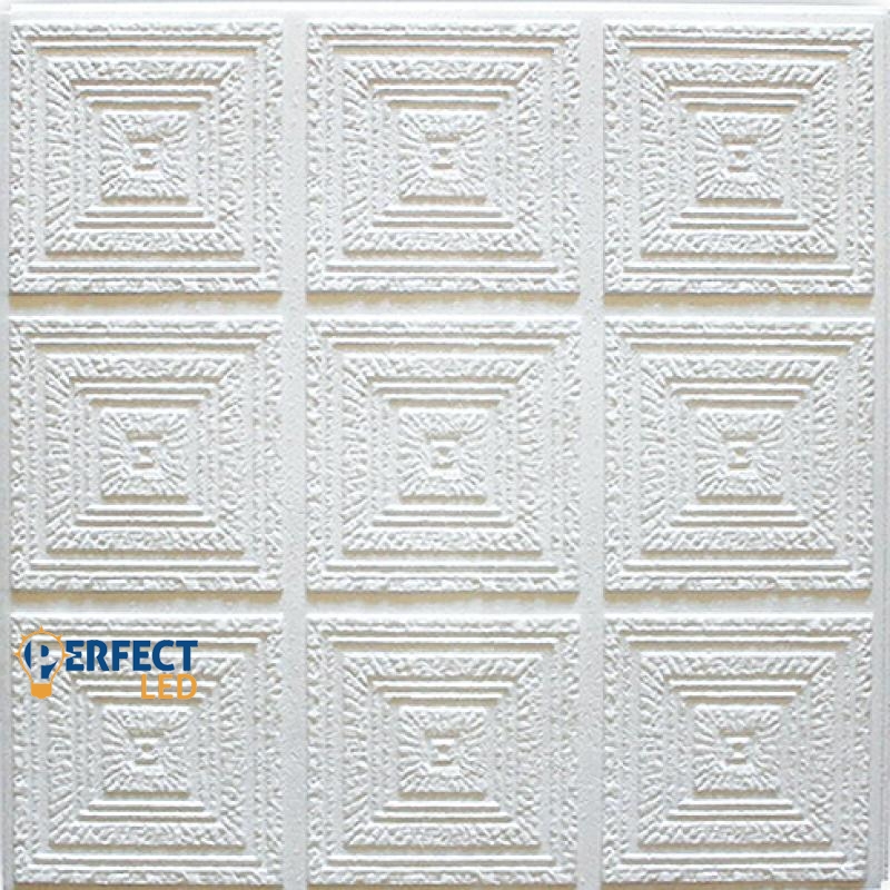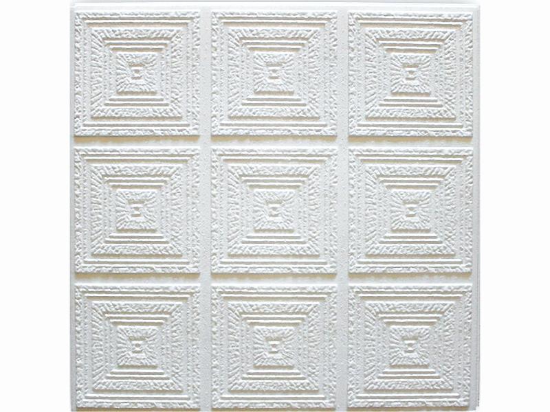A Marbet polisztirol mennyezeti burkolólapból 1 négyzetméter 4 darab 50 cm x 50 cm-es burkolólapot tartalmaz. A beépített mennyezeti burkolólapok egymás melletti mintáját a nagyítható képeken tekinthetik meg.
