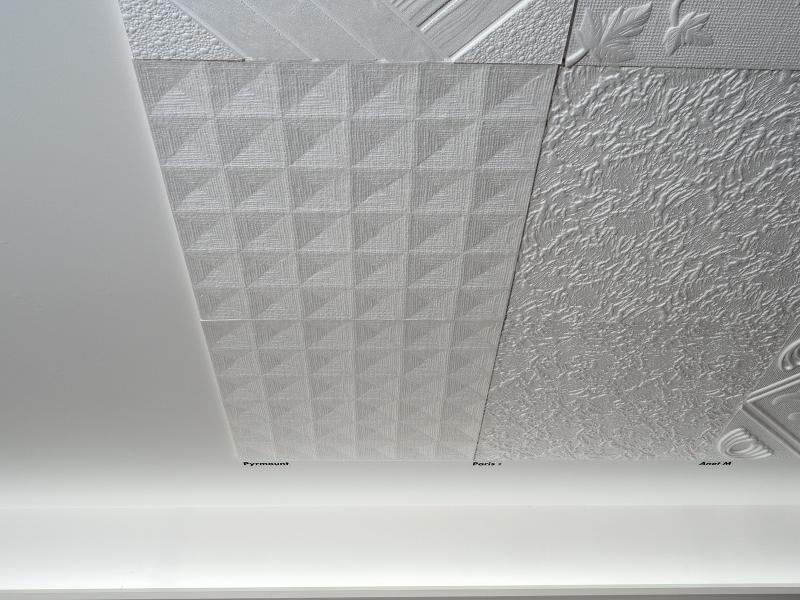 A Marbet polisztirol mennyezeti burkolólapból 1 négyzetméter 4 darab 50 cm x 50 cm-es burkolólapot tartalmaz. A beépített mennyezeti burkolólapok egymás melletti mintáját a nagytíható képeken tekinthetik meg.